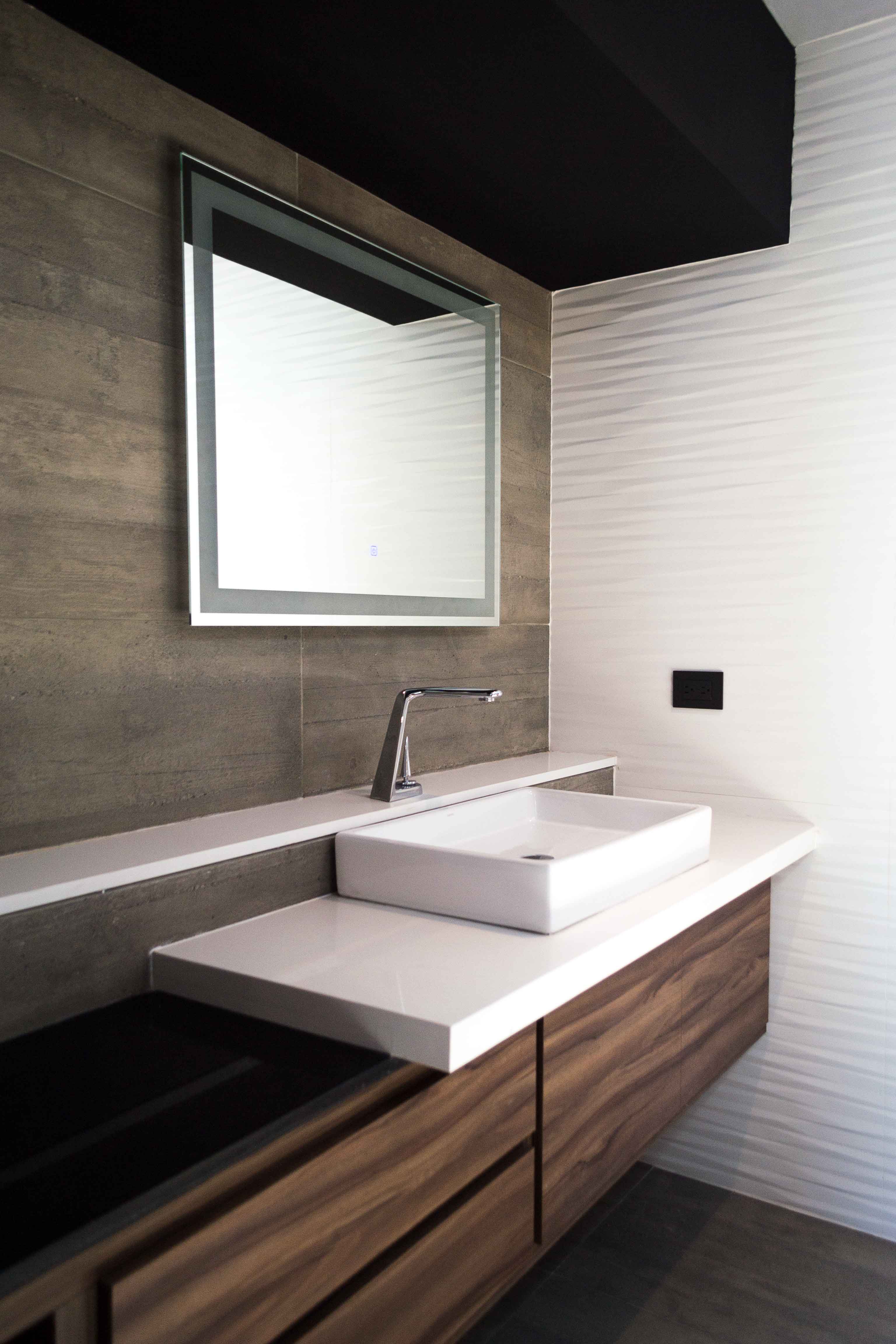 La selección de acabados finales fue, con la colaboración del Arq. Carballo, haciendo énfasis en la división de espacios abiertos por medio de los mismos. La pasta con más protagonismo en el proyecto es el Corevstone Pietra negro de la marca Corev, logrando así un buen balance entre texturas lisas y acabados con toques naturales y orgánicos. El diseño de la celosía exterior, fue diseñada a medida y basadas en especificaciones del Arq. Carballo y del cliente.